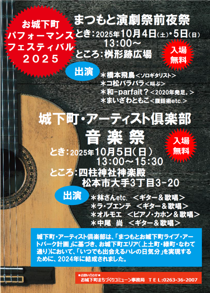 2025.09.29 「お城下町パフォーマンスフェスティバル2025」10月4日(土)・5日(日)に開催! 今年は、桝形跡広場・四柱神社神楽殿ステージの2会場にて開催!全て入場無料ですので、涼しさが増してきました”秋のひととき”を野外で満喫してみてはいかがでしょうか! 詳しい内容は、こちらのチラシにて、お確かめください!! 【お問い合わせ】お城下町まちづくりコミューン事務局(上土商店街振興組合内) TEL.36-2007 シェアする