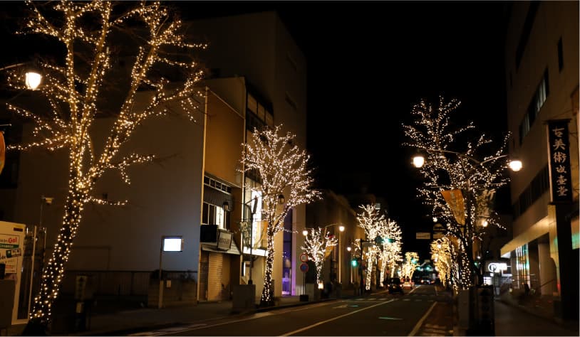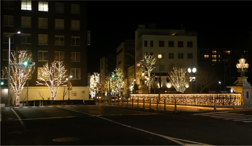 大名町通りから千歳橋へ優しく温かな光が灯り、冬の「まつもと」を照らします。大名町通りは華やかな木の電飾が皆さんをお迎えし、千歳橋ではガス灯とマッチしたイルミネーションが松本の夜を飾ります。松本でしか体験できない非日常の空間へ、ぜひ足をお運びください。