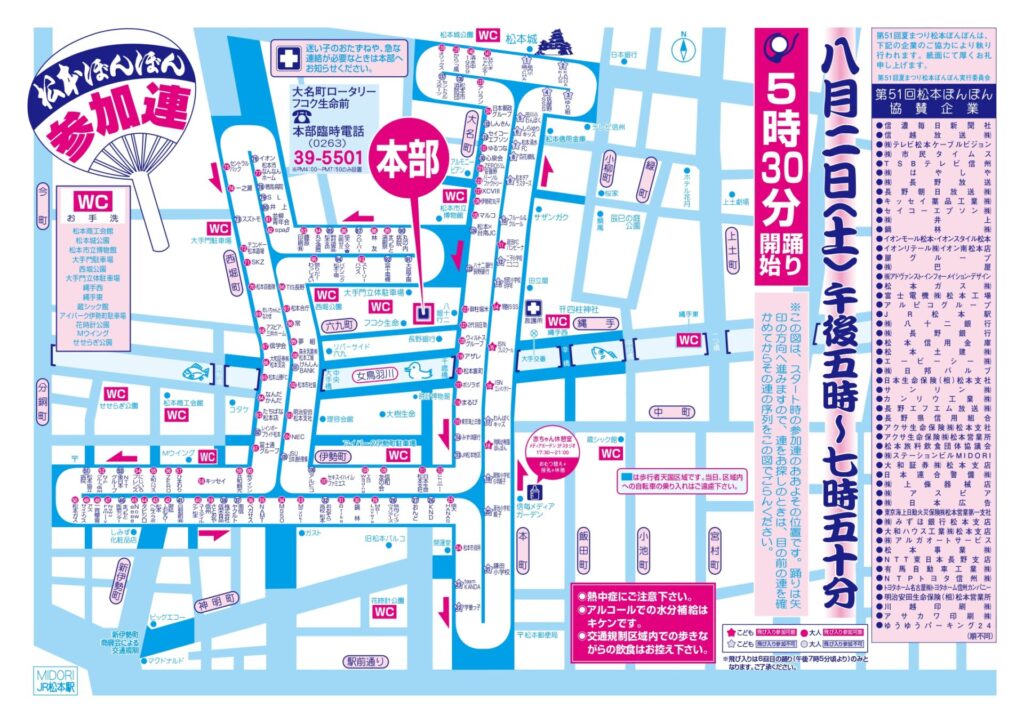 また、こどもの部・大人の部それぞれで、飛び入り参加を受け入れる連があります。(こどもの部・大人の部で番号の印が赤色になっている連) 見物の方で松本ぼんぼんを踊ってみたい、体験してみたいという方がいらっしゃいましたら、6回目の踊り(午後7:05分頃)に参加いただけます。お近くの受け入れてもらえる連にお声がけください。ただし、アルコールを飲んだ方の飛び入り参加はご遠慮願います。
