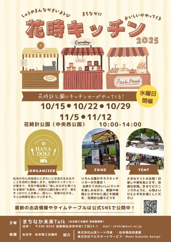 松本の中心市街地にある花時計公園で、地域のキッチンカーを集めて、地元の方や観光客が楽しみながら食べられる場所、「花時キッチン2025」を開催します!
